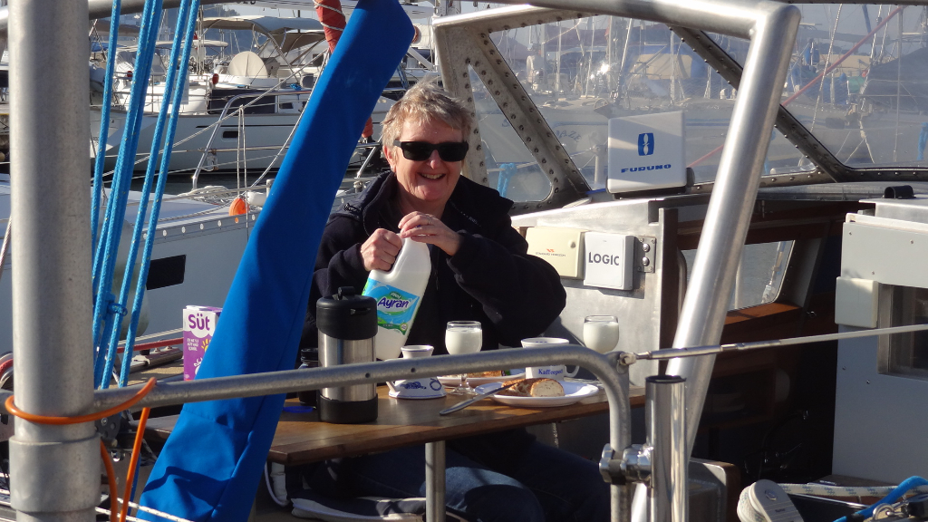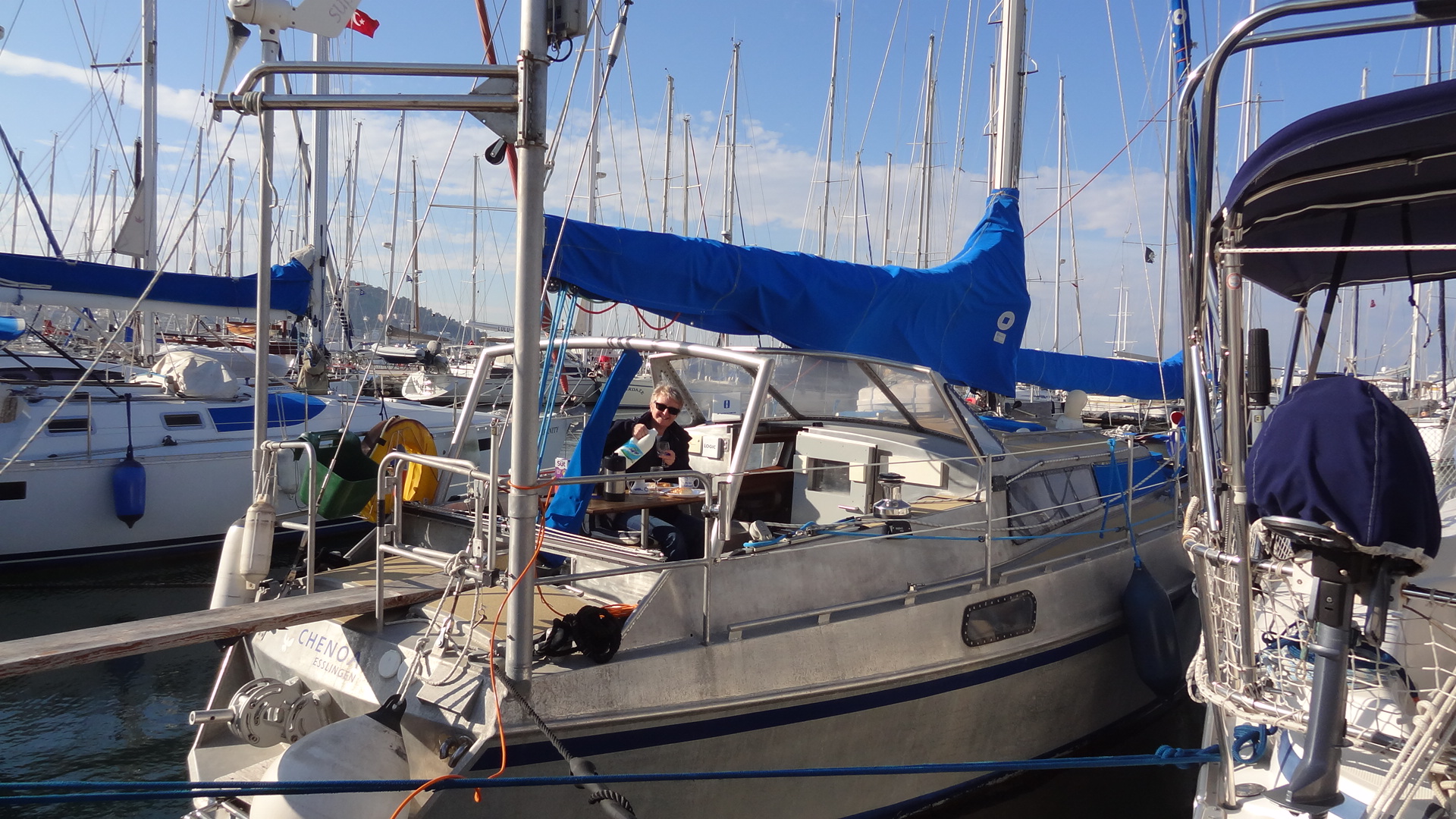Kusadasi – Seit Sonntagabend um 20 Uhr sind wir nun in Kusadasi. Wir sind zumindest körperlich angekommen. Unser Flug war unspektakulär, das Gepäck blieb heil und unser Taxifahrer stand pünktlich wie immer am Flughafenausgang und holte uns ab. In der Marina angekommen, schleppten wir unsere vier Riesengepäckstücke zum Schiff und gingen erst einmal in der Hafenkneipe einen Fisch essen und ein Bierchen trinken. „Jetzt gibt es kein zurück mehr“, sagte Stephan. Aber das wollen wir ja auch nicht. Wir schliefen tief und fest in unseren Kojen und am nächsten Morgen weckte uns die Sonne. 20 Grad, ein herrlicher Tag. Als erstes schafften wir uns etwas Ordnung und sichteten unsere Kleider, dann die Lebensmittel und die Küchenutensilien. Am Abend war dann schon alles an seinem Platz, wobei Stephan klagte, dass wir zuviel haben. Ich tröste ihn: „Wir brauchen doch noch etwas, wenn wir in die Gegenden fahren, wo es nichts im Überfluss gibt und können es dort verschenken. Wir haben so viele Messer, T-Shirts, eigentlich von allem. Eigentlich alles zu schade zum Wegwerfen, aber wir brauchen gar nicht mehr so viel. Es wird sich alles zurechtruckeln und mit der Zeit werden wir wissen, was wir wirklich benötigen im Leben.