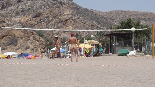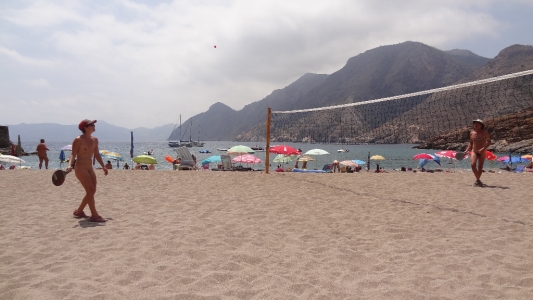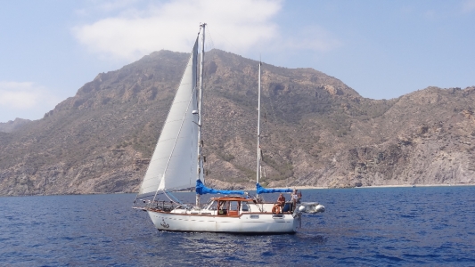 El Portus – Cartagena – Spanien / „Qué calor“ hört man hier ständig und überall. Auch hier in Spanien stöhnt man über die Hitze, nunja, hier ist sie jedes Jahr gleich. Wir haben draußen meist so 40 bis 45 Grad Celsius, im Boot sind es zwischen 30 und 35 Grad Celsius, des nächtens kühlt es auf ungefähr 20 bis 28 Grad runter. Wir sitzen also auch um 24 Uhr noch im Bikini im Cockpit oder auch mal ganz nackig – als wir zwei Tage in einer Badebucht vor einem FKK-Campingplatz lagen. Auch dort geht alles recht ruhig zu, denn tagsüber wagt man wenige Schritte raus, höchstens mal zum Swimming Pool oder Meer und dann zur Dusche. Wir durften im Campingplatz duschen und ich habe ein ganz schlechtes Gewissen, so viel geduscht wie an diesem Tag haben wir schon lange nicht mehr. Es war zwar sehr schön, aber woher kommt das Wasser? Woher kommen die Massen an Wasser, die hier verbraucht werden? Was für einen Sinn macht es, sich zu duschen und danach gleich wieder ins Meer zu hüpfen? Es hat hier schon seit Monaten nicht geregnet und gestern abend haben wir sogar ein, zwei, drei Tröpfchen abbekommen. Wieder nichts mit einer schönen Bootsdusche. Auch Blumen können hier nur überlegen, wenn sie ständig gegossen werden. Sonst wäre hier richtig Wüste, denn auch Palmen brauchen ab und zu Wasser. Das Gebiet um Cartagena ist von daher nicht so schön, es ist hart, steinig, felsig und gar nicht fruchtbar und grün.