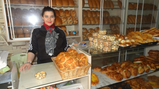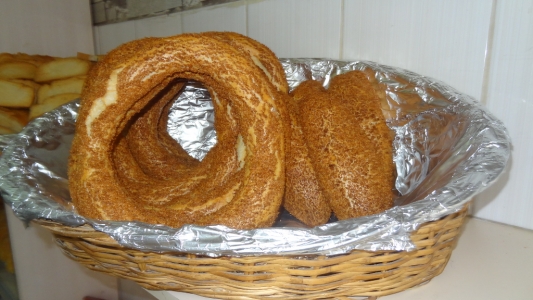 Kusadasi – Jeden Morgen radle oder jogge ich oder Stephan zum Bäcker die ca. ein Kilometer lange Küstenstraße entlang. Von der Küstenstraße müssen wir in ein schmaleres Gässchen abbiegen, dann in ein noch schmaleres und noch eins bis wir zu einem Bäcker kommen, der das beste Brot in ganz Kusadasi macht – unserer Meinung nach. Mit einem fröhlichen „Gün aydin“ werde ich jeden Morgen von Dilara begrüßt, dann werde ich mit kleinen runden Gebäckstückchen gefüttert und ich kaufe mein „büyük bir simit“, einen großen Sesamkringel. Er ist kross gebacken und schmeckt einfach herrlich. Aber auch die anderen Dinge sehen toll aus. Wir haben schon einiges ausprobiert, aber wir bleiben bei unserem Simit. Jeden Tag wird in der Backstube frisch gebacken, auch das Fladenbrot schmeckt hervorragend, vor allem mit Gemüseeintopf oder mit Spiegelei, Knoblauch und Chili, ein anderer Favorit zum Frühstück.