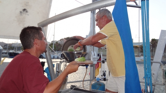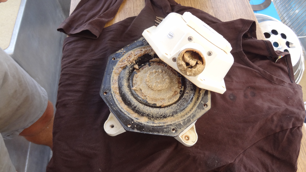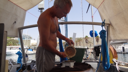 Cartagena – Spanien / Die letzten Tage sollten dazu da sein, noch ein bisschen los zu lassen, zu geniessen, die Zeit miteinander zu verbringen. Die Zeit verbringen wir nun damit miteinander, unser „Badezimmer“ auseinander zu nehmen. Es fing damit an, dass Stephan einen Schlauch austauschen wollte, weil unsere Toilettenspülung nicht mehr richtig pumpte. Das wollte er eben mal machen, bevor unsere Gäste zum Abendessen kommen. Aus einer „mal eben halben Stunde“ wurde eineinhalb Stunden, es stank gewaltig und das Ergebnis sahen wir dann. Der Schlauch, ca. 6 cm Durchmesser, war mit Urinstein fast zugewachsen, so dass nur noch der kleine Finger reinpasste. Kein Wunder kam da das „große“ Geschäft nicht mehr durch und die Pumpe ging immer so schwer. Meist roch es auch nicht sehr schön, wenn wir die Klopumpe betätigen (für die Nichtsegler: die Klopumpe ist eine Handpumpe, die man nach oben und unten drücken muss, damit das „Geschäft“ abgepumpt wird, gleichzeitig wird dann auch Wasser eingepumpt, so dass immer etwas Wasser, wie in einem normalen Klo steht – also nichts elektrisch oder mal kurz die Klospülung betätigen.) Er nahm den zweiten Schlauch raus, die gleiche Sauerei. Und die Pumpe war völlig verstopft. Er hörte dann erst mal auf zu arbeiten, als unsere Gäste kamen und wir machten am nächsten Tag weiter.