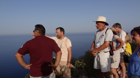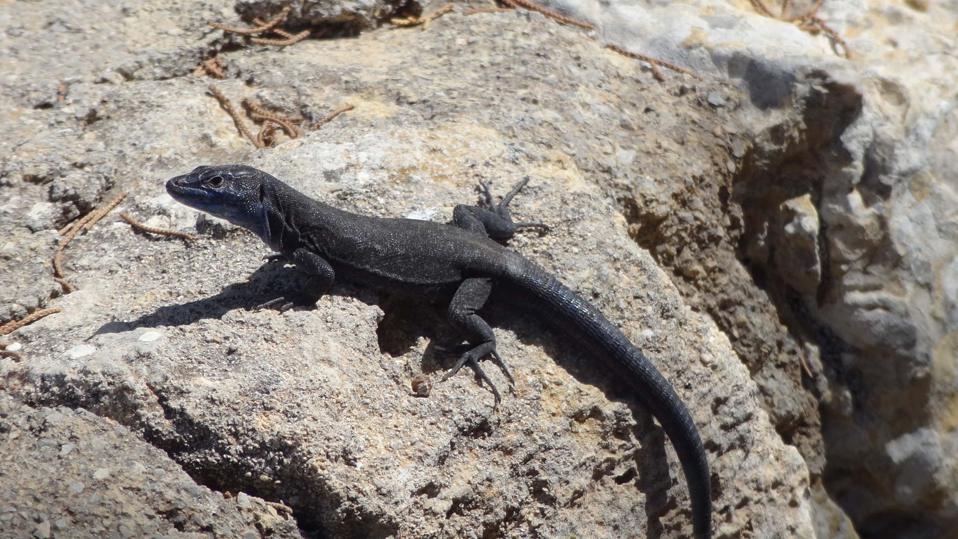 Bei der Wanderung, die um 18 Uhr abends begann, weil es am Tag rund 40 Grad Celsius und mehr hatte, erfuhren wir viel über die Geschichte, über Flora und Fauna. So ist die schwarze kleine Eidechse nur hier zu bestaunen. Zugvögel kommen hierher und nisten oder überwintern, es gibt den bedrohten Fischadler und die bedrohte Korallenmöwe. Einst dienten die Felsenbuchten Piraten als Unterschlupf. Die Festung stammt aus dem 14. Jahrhundert . An ihren Wänden erinnrn in den Stein gekratzte Inschriften französischer Soldaten an eine Tragödie. 1808 wurden 9000 Franzosen nach Cabrera verbannt und praktisch sich selbst überlassen. Als man sie sechs Jahre später freiließ, hatten Hunger und Krankheiten fast einem Drittel das Leben gekostet. Man will sich gar nicht ausmalen, wie das war. So hat jede schöne Seite auch einen dunklen Fleck.