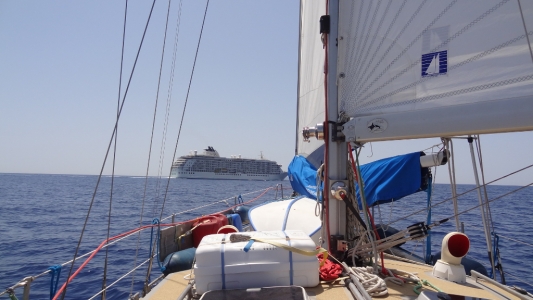 Ihr fragt euch sicher. Wie machen die das eigentlich mit Waschen, Spülen, Putzen, Wasser, Kochen etc.: Wir brauchen im Moment sehr wenig zum Leben. Auf dem Boot sind wir entweder nackig oder im Bikini bzw. Badehose. An Land ziehen wir dann unser im Moment gebrauchtes T-Shirt an und eine kurze Hose bzw. Rock. Da wir jeden Tag mehrere Male ins Wasser hüpfen, wäre es eine Verschwendung, uns jedes Mal abzuduschen. Deshalb riechen wir nach Meer, aber nicht nach Iltis, denn wir sind immer gut erfrischt – auch wenn die Haare ein bisschen wie bei Pummuckel nach oben stehen. Unser Geschirr waschen wir mit Salzwasser zuerst vor, dann mit einem winzigen Strahl Brauchwasser nach. Wenn wir segeln, machen wir den Wassermacher an, der uns dann neues Wasser produziert, rund 8 Liter in der Stunde. Das reicht dann auch wieder für die nächsten Tage – unser Tank hat aber 360 Liter Kapazität, wir sitzen also noch lange nicht auf dem Trockenen, möchten ihn aber auch nicht bis zum letzten Tropfen ausschöpfen. Zudem haben wir noch einen 150-Liter-Trinkwassertank für unser Koch- und Trinkwasser. In unserem Vorratslager ist alles vorhanden für leckere Gerichte. Noch haben wir vier Gläser selbsteingemachten Thunfisch aus eigenem Schlachtung, wir haben jede Menge Nudeln und Trockenfrüchte (Linsen, Kichererbsen, Bohnen), frische Tomaten, Gurken, Zwiebel, Knoblauch, Chili, ein großes Stück Käse und ein großes Stück Salchicha, Honig, Erdbeermarmelade, Äpfel, Orangen, Bananen, Melonen – und wenn uns die Gier mal nach etwas ganz ungesundem überkommt, so holen wir die saure Apfelringtüte oder Coca-Cola-Sweeties heraus. Das muss dann am Abend auch mal reichen. Und auf ein kaltes Bierchen oder einen kalten Saft müssen wir auch nicht verzichten – alles steht im Kühlschrank bereit.