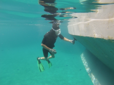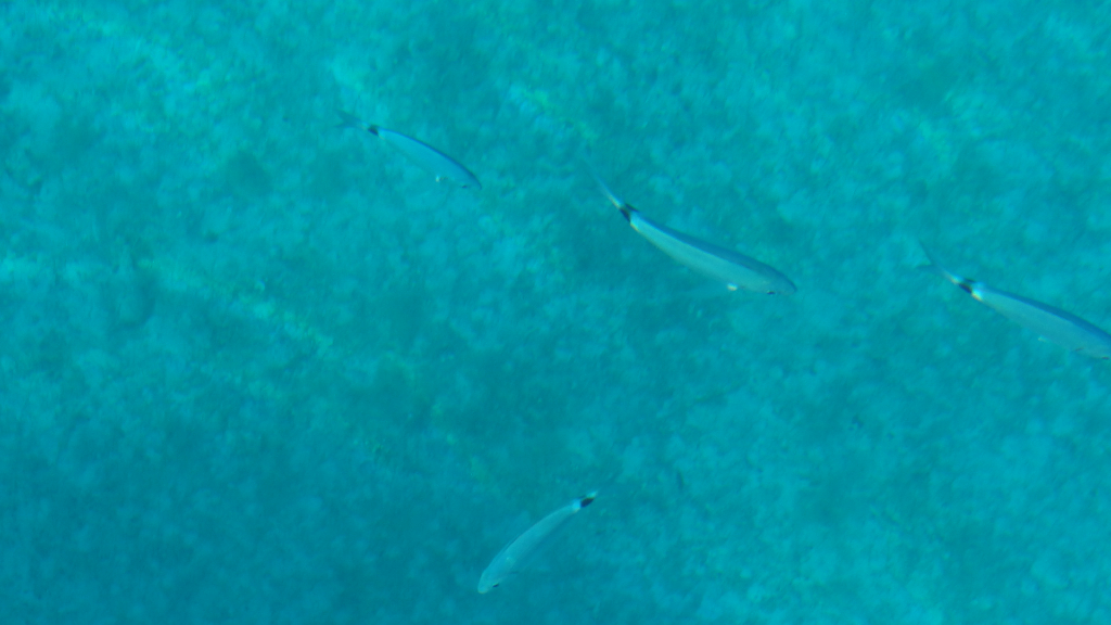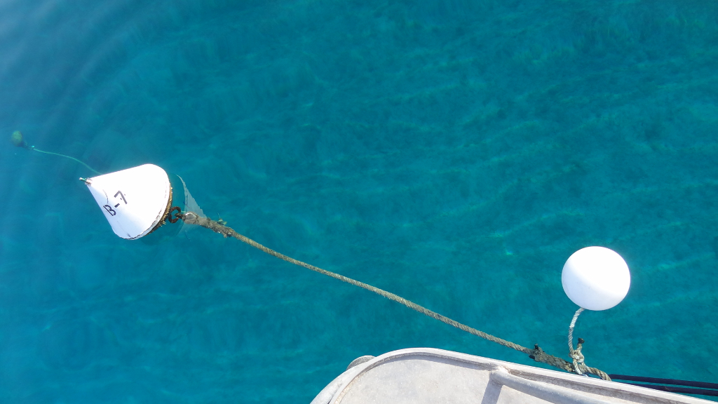 Mit dem Schiff darf man die Insel nur mit Voranmeldung besuchen und bekommt dann eine Bojenreservierung. Die gilt für zwei Nächte. Wir liegen wirklich traumhaft bei sehr ruhigem Wetter in dieser Bucht, die tief in die Insel einschneidet – fast wie in einem See. Wenn ich morgens ins Wasser springe, tauche ich in türkisblaues klares Wasser ein. Die Fische schwimmen um mich herum, wir schnorcheln an das steinige Ufer. Dort liegen orangene Seesterne, wir schwimmen durch Fischschwärme mit kleinen blauen Fischchen, größere Fische mit bunten Mäulern kommen auf uns zu.