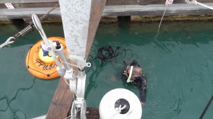 Zum Bild: Heute haben wir im Fockbaum eine neue Leine für den Unterliekstrecker eingezogen. Die Leine schamfielte (scheuerte) immer am Einzug und wir hatten dies nicht beachtet, als wir in der Türkei losfuhren. Da wir ja unsere Segel aufgrund der Bolzerei gegen den Wind sehr beanspruchten, ist die Leine dann gerissen. Wir konnten dies zwar …