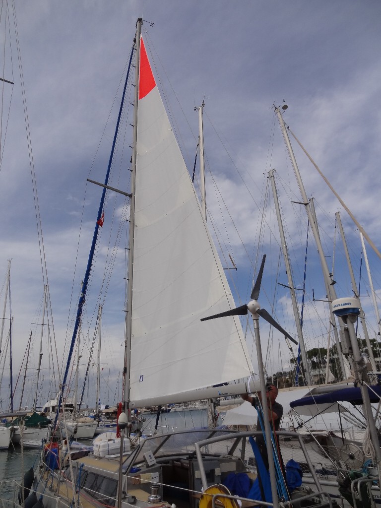 Schönes neues Segel - ein Schwedengroß - passt exaktKusadasi/Türkei – Heute morgen war Markttag. Da war es noch schön windstill. Am Nachmittag begannen wir dann, die neuen Segel zu setzen und hui kam auch schon der Wind. Dennoch haben wir das erste Segel zum ersten Mal ausprobiert, das wir in Deutschland in der Segelwerkstatt Stade haben machen lassen: ein Schwedengroß, dass wir dann ab Argentinien Richtung Süden benötigen, weil es kleiner, konkav geschnitten und zudem ein sehr festes Material ist, Es kann drei Mal gerefft werden, so dass beim 3. Reff nur noch ein Trysegel, also die knallorangene Spitze des Segels, zu sehen ist. Leider war es dann auch schon mit dem Segelsetzen und ausprobieren des Großs, der Fock und der Genua.. Wir hoffen, dass wir morgen einen windstillen Tag haben werden.